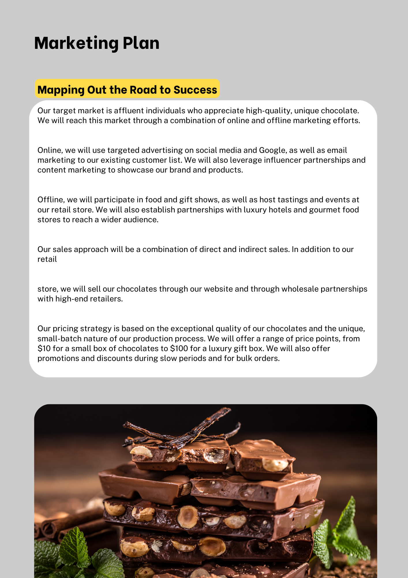 Here is an example of a marketing and sales strategy for a business that sells artisanal chocolates: