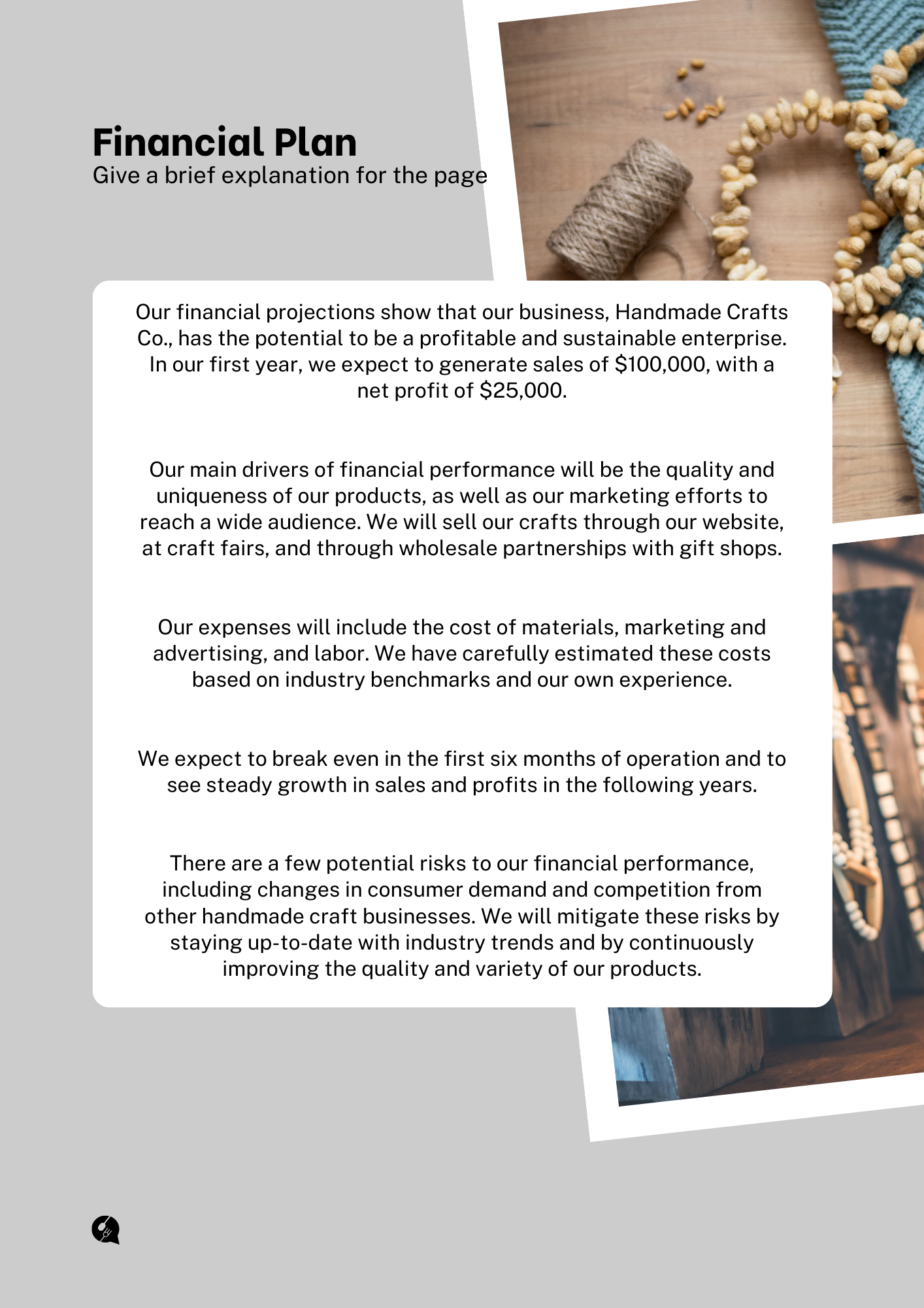 Here is an example of a financial plan for a business that sells handmade crafts: