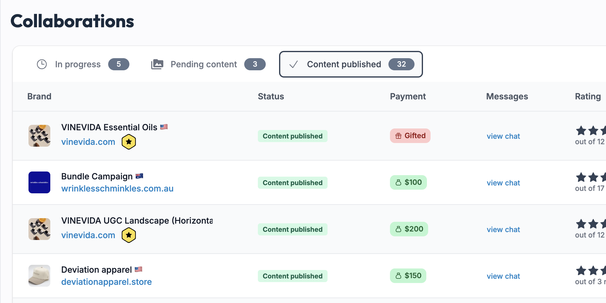 Track every campaign from application to completion. See deliverables, timelines, and payment status at a glance.