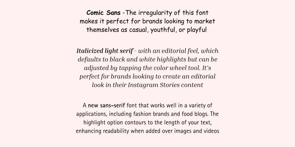 • Fonts: Fonts capture your personality, whether it's official, casual, playful, or elegant. To maintain consistency, use the same typefaces on all of your Instagram Story designs. Stick to 2-3 different fonts for titles, subtitles, and body text as a general rule of thumb.