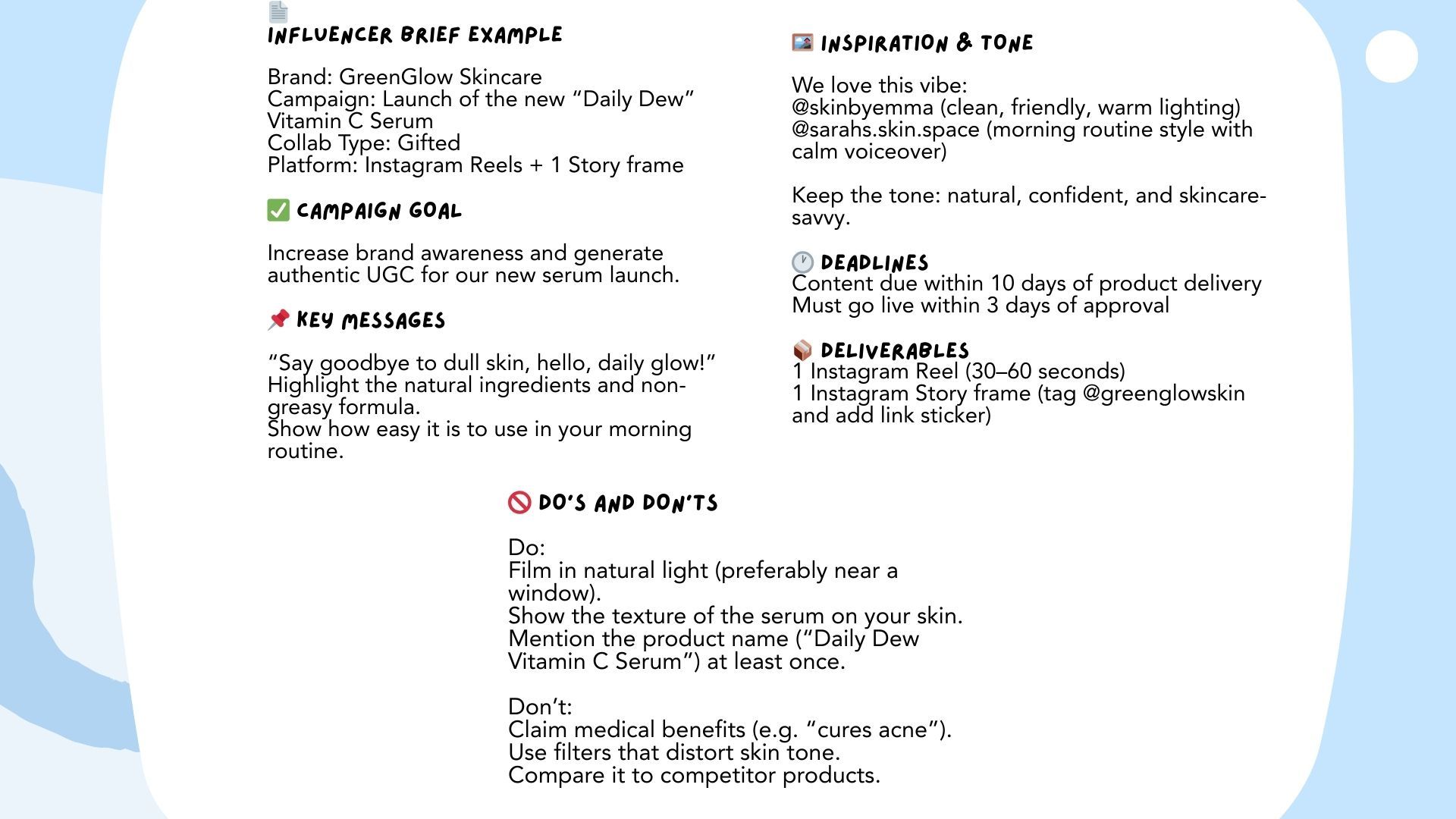 If your influencers don’t know what you want (or worse, misunderstand it), you’ll spend hours fixing content that could have been great from the start.